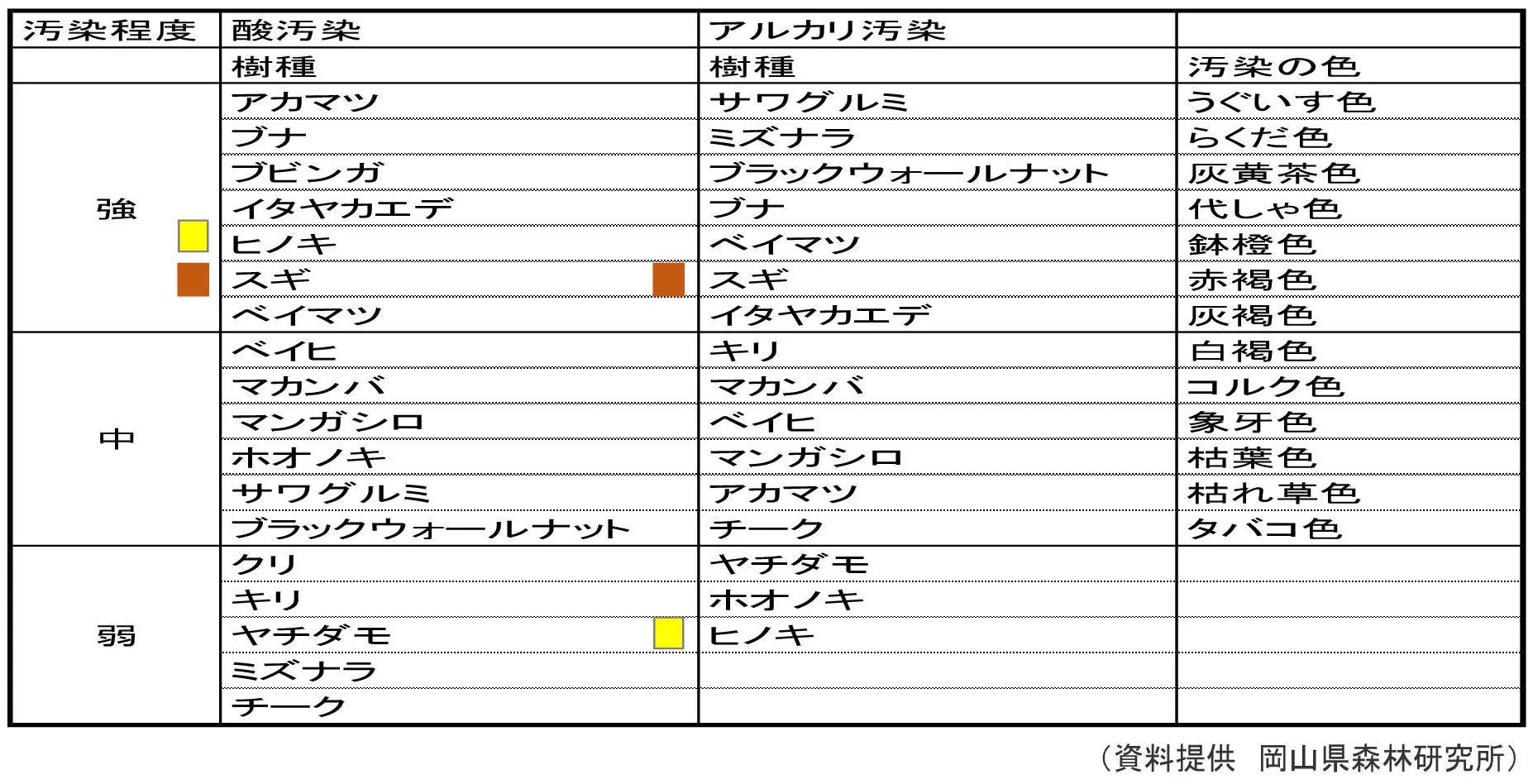 これは木材の成分がアルカリや酸と反応することが原因で、樹種によってそれぞれに弱いもの、強いものがあります。