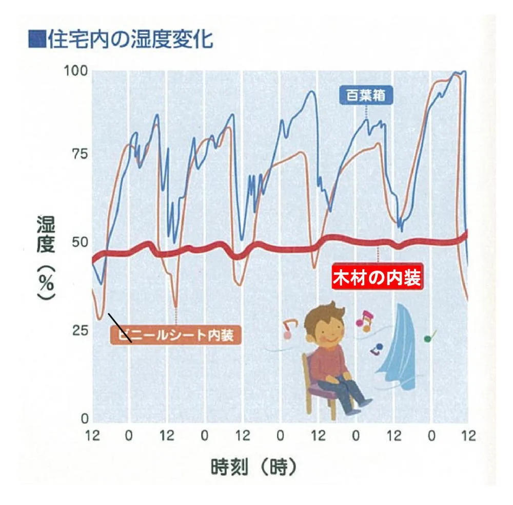 木は湿度が高くなると水分を吸収し、逆に低くなると水分を放出して湿度を一定に保とうとする働きがあるので、室内に使うと快適に感じるのです。下のグラフは百葉箱、ビニールクロス、及び木材の環境を設定し1日の湿度変化を測定したものです。木材を内装に用いた住宅は1日を通して一定の湿度を保っており快適な住空間を提供してくれます。参考文献 「なぜ新築マンションには自然素材が使われないのか」 「岡山県産材利用のすすめ」